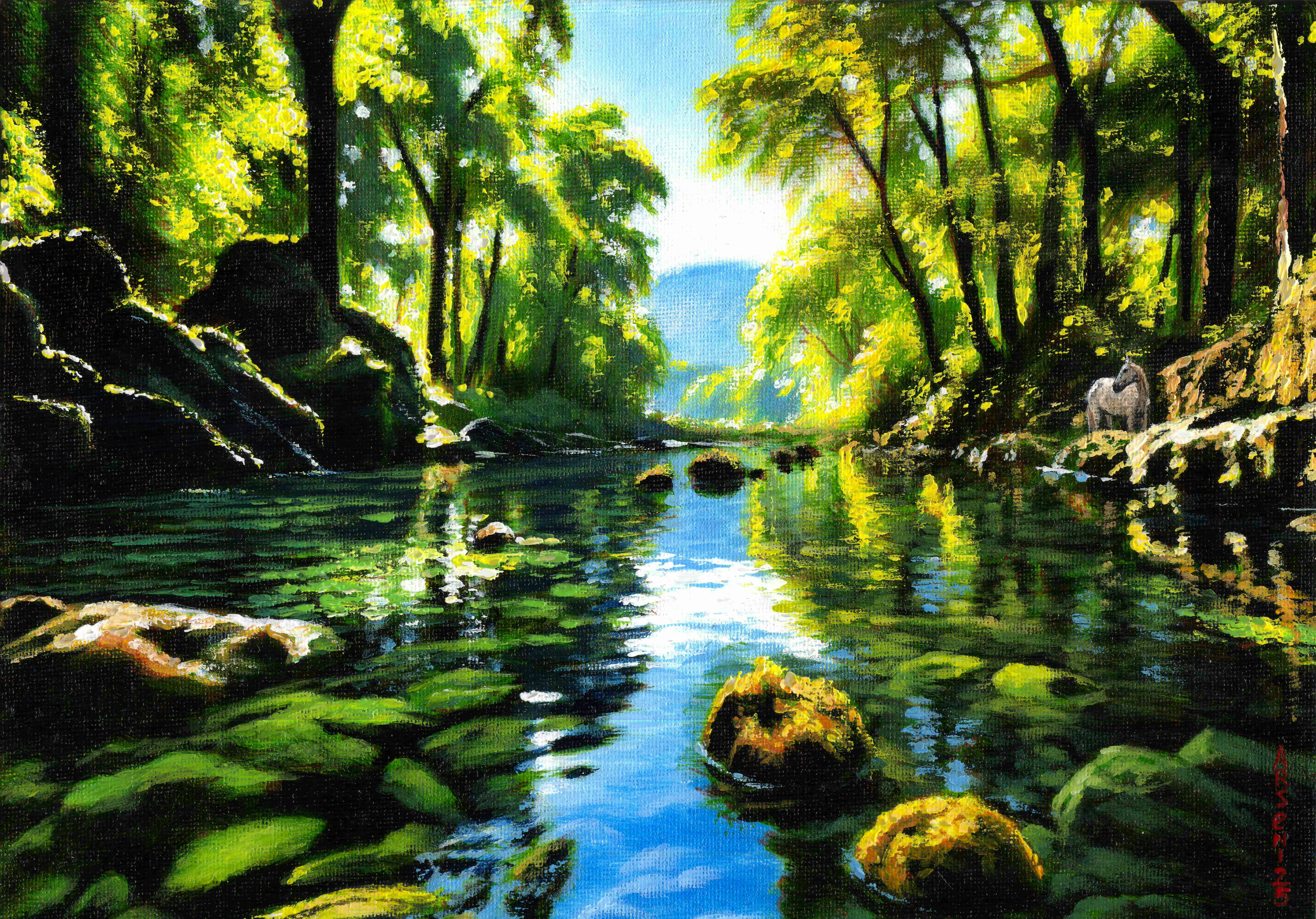 My paintings are designed so that when even a drop of light hits them, the reflected light is doubled. The intensity of the paint colors and the special technique create the illusion that the light emanates from within the painting.