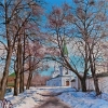 The painting depicts a winter landscape, captivating the coziness and tranquility of rural nature. The central element of the composition is a small temple with a high green roof and snow-white walls, which seems to rise above the snow-covered yard. Its light architecture emphasizes purity and spirituality, creating a sense of peace.