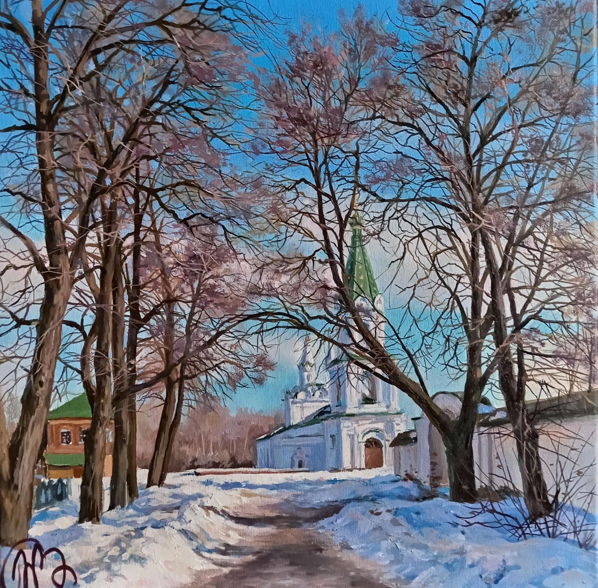 On the right, you can see a fence protecting the temple, and in the depths on the left, you can see a red wooden house, adding warmth and coziness to the rural landscape. The transparent light of a winter day and soft shadows on the snow give the painting lightness and realism.