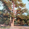 In the background, a calm pine forest can be guessed, stretching into the distance. It becomes a kind of frame for the central pine tree and enhances the feeling of coziness and harmony. In the right part of the painting, a small white building is visible, which harmoniously fits into the landscape, adding a domestic note and a hint of humanity in this corner of nature.
