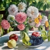 The painting radiates the warmth and coziness of a summer day. The main focus is on a large bouquet in a vase filled with fluffy asters: white, pink and yellow. The flowers seem to be bathed in soft sunlight, which gives them liveliness and volume, emphasizing the texture of the petals. The bouquet looks bright and festive, symbolizing the joy and beauty of the moment.