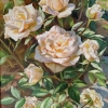 The painting depicts magnificent white and cream roses in full bloom, conveying the tenderness and exquisite beauty of nature. Lush buds, with light shades of peach and yellowish colors, open up, as if giving their charm and subtle aroma, which can be felt while looking at this canvas.