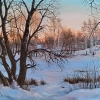 The painting depicts a winter landscape, permeated with the soft light of the sunset. The blue sky, stretching into the distance, merges with a warm pinkish glow on the horizon, creating a contrast between the cold winter and the warm light of the setting sun. The trees, covered with light snow, look fragile and graceful, their branches intertwined, as if creating a natural pattern.