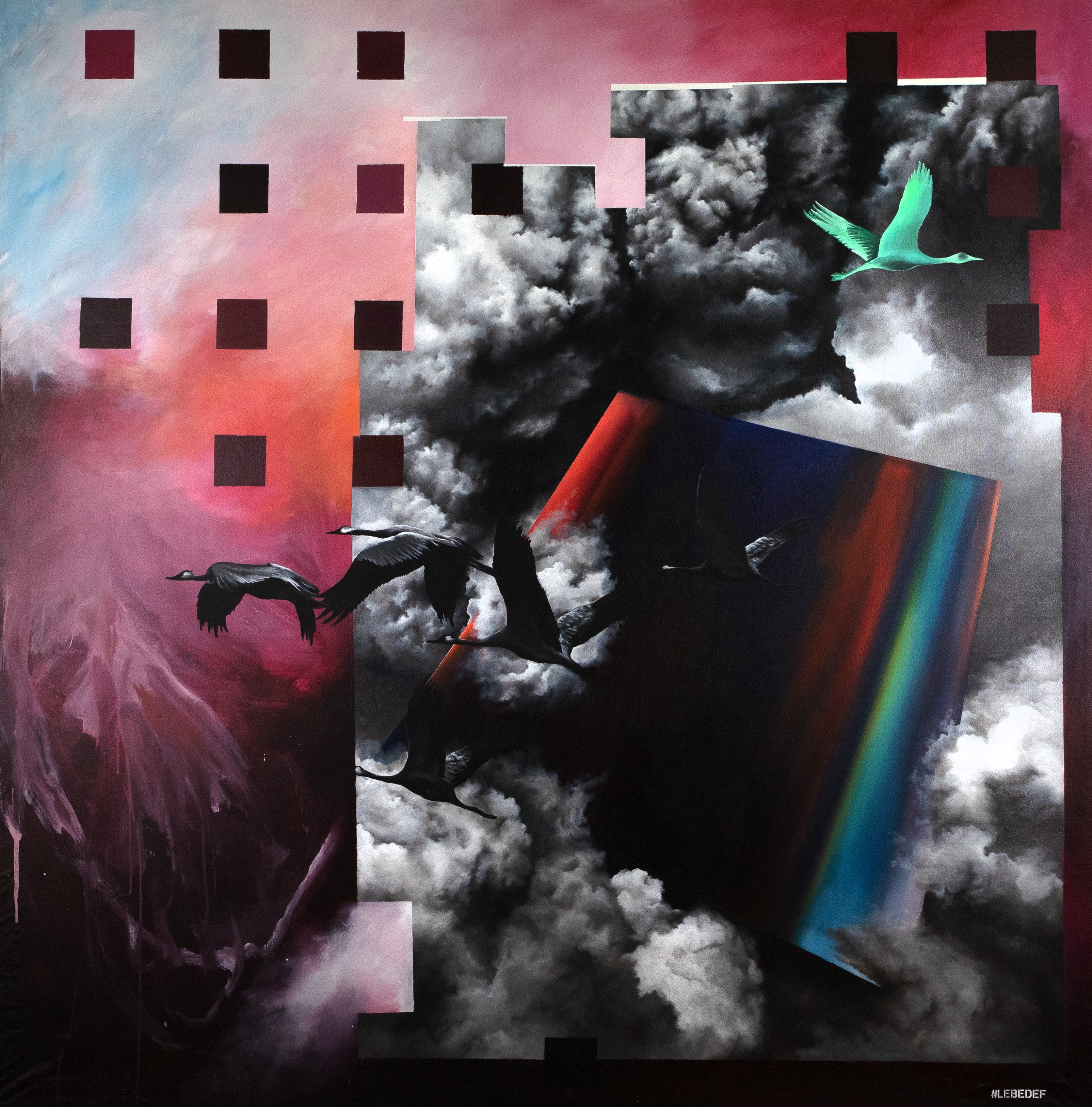 The painting captures an almost imperceptible yet decisive moment: a flock of birds moves in one direction—as a single organism, governed by instinct, rhythm, and the logic of the majority. And only one bird, bright green, like a glitch in the system, deviates from the common vector and flies its own way.