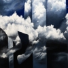 The silhouette emerging from the clouds is not only a symbol of freedom but also an image of a person breaking out of structured reality: the vertical stripes resemble data, code lines that restrict movement.