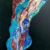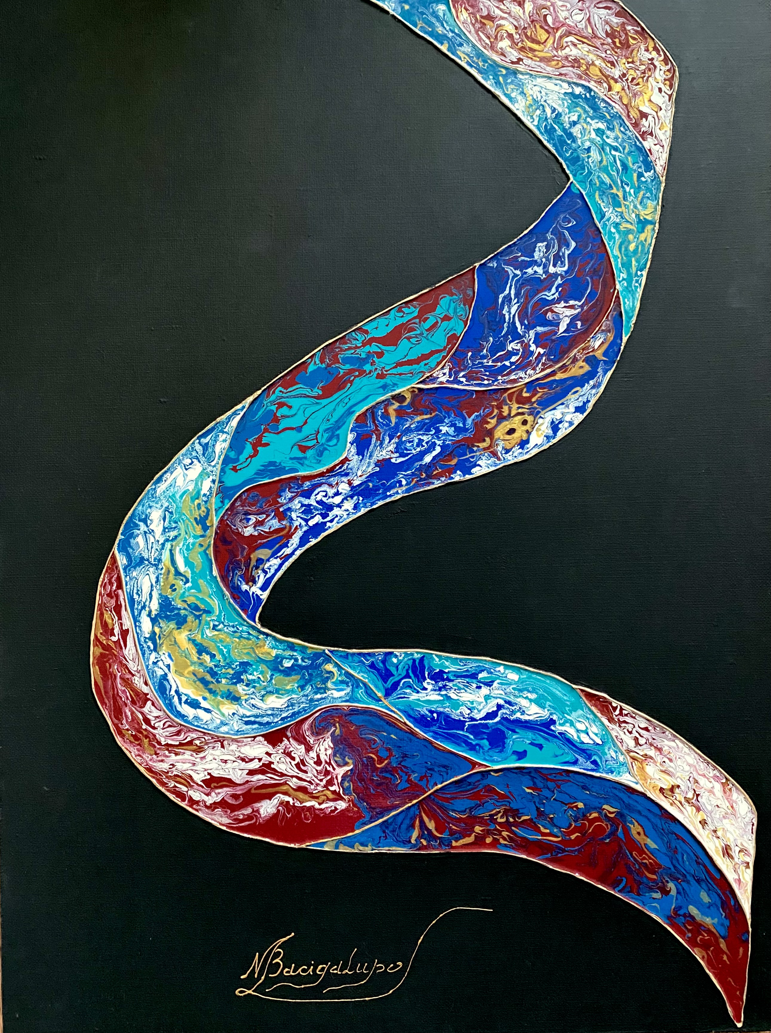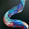 The work explores movement and rhythm of form. Glossy color flows of enamel contrast with the black matte background, creating a sense of depth and continuous motion.