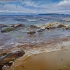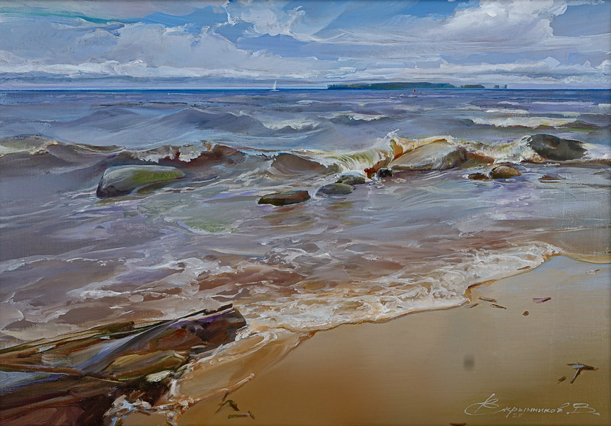 In the foreground, we see a sandy shore washed by waves that foam and break against the stones, creating a sense of freshness and coolness. Skrynnikov masterfully works with color: from deep blues and steel shades in the distance to warm ochre tones of the coastal sand.