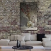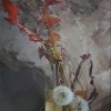 The painting depicts a vase with faded dandelions, some of which have already turned into white seed balls, waiting for a gentle breeze. The vase, leaves, and even the water still retain the warmth of the departing summer. The contrast is heightened by the granite wall against which this scene unfolds.