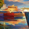 Картина Владимира Григоряна «Яхта на закате» — это симфония цвета и света, наполненная энергией и романтикой морской стихии. Художник создает впечатляющий образ порта, где современные яхты, освещенные лучами заходящего солнца, приобретают торжественный, почти монументальный вид. Насыщенные контрастные цвета — от глубокого синего неба с розовыми облаками до золотисто-оранжевых корпусов и их отражений в воде — передают неповторимую атмосферу вечера.