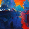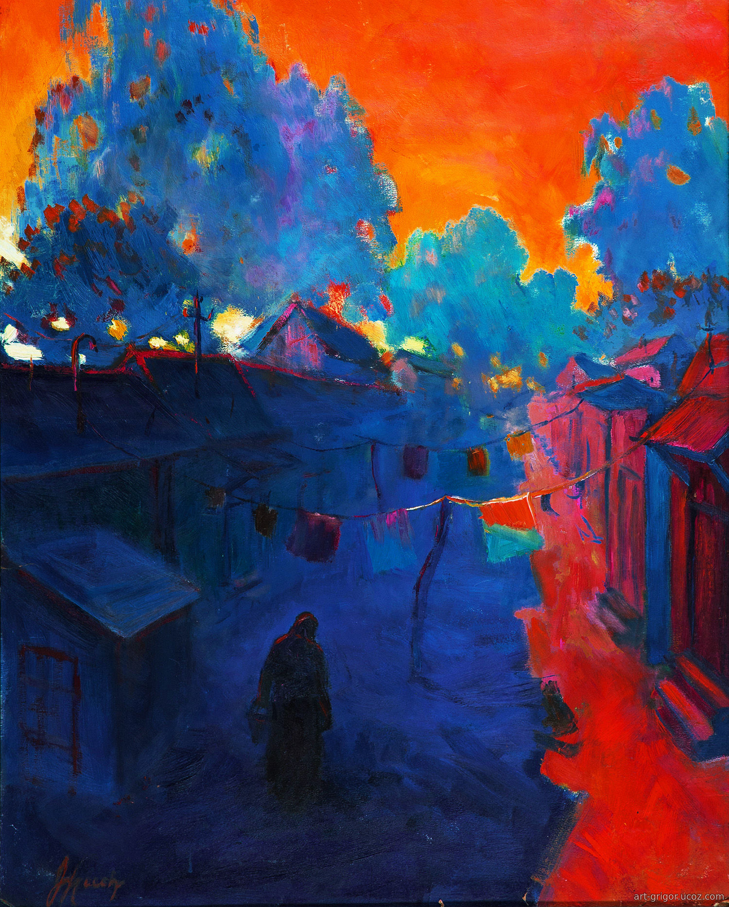 Vladimir Grigoryan's painting «The little red courtyard» is a profound, almost mystical piece in which everyday life takes on the qualities of a fairy tale. The artist masterfully uses a sharp contrast between the deep, piercing blue that envelops the space and the fiery red breaking through the twilight. This color conflict creates a sense of unreality, as if the courtyard exists on the border between reality and a dream.