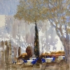 The painting depicts a cozy corner, immersed in the charm of shade and soft light. Under spreading trees, whose foliage creates a whimsical lace pattern, there are tables covered with white tablecloths decorated with bright blue accents. The space seems ready to welcome guests, inviting them to a leisurely rest in the shade of nature.