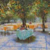 Rows of neatly laid tables with cheerfully bright orange tablecloths invite you to a meal and rest. The central place is occupied by a table with a green checkered tablecloth, on which there are bottles, glasses and fruits - these details speak of the anticipation of a friendly meeting or a family holiday. Light white chairs add airiness to the composition.