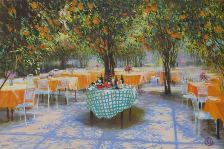 The natural beauty of the orange grove and the serenity of the open space convey an atmosphere of warmth, comfort and harmony. The painting makes you want to stop, enjoy the moment and feel the joy of simple existence under the blessed rays of the sun.