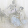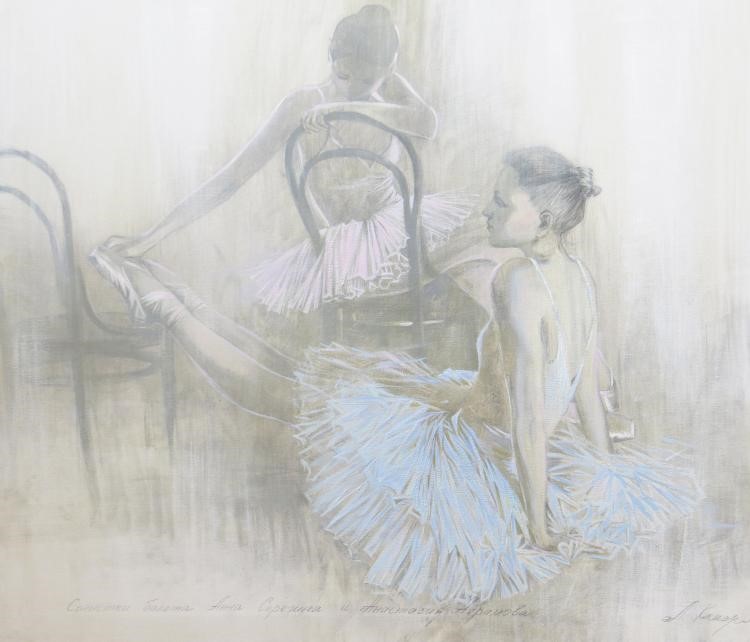 The painting depicts a scene from the backstage life of ballerinas, conveying their tenderness and mysterious fragility. The focus is on two graceful girls dressed in airy tutus: one in pink, the other in blue. Their poses are calm, as if they are resting after long training or performance.
