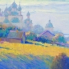The painting conveys the atmosphere of a quiet and peaceful rural landscape against the backdrop of a magnificent temple, immersed in the morning fog. The central element of the composition is the golden fields, bathed in soft sunlight, which focuses attention on the richness of nature. Silhouettes of ancient domes rise above the fields, seeming to float in a light haze, creating a sense of spirituality and eternity.