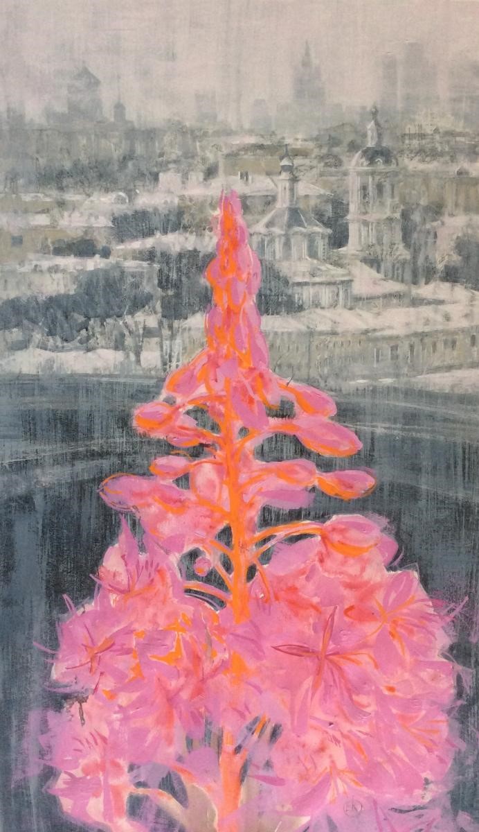 This original artwork "Ivan-tea. Moscow. Raushskaya embankment" was created by the contemporary Russian artist Elena Komarova and is available for sale online.