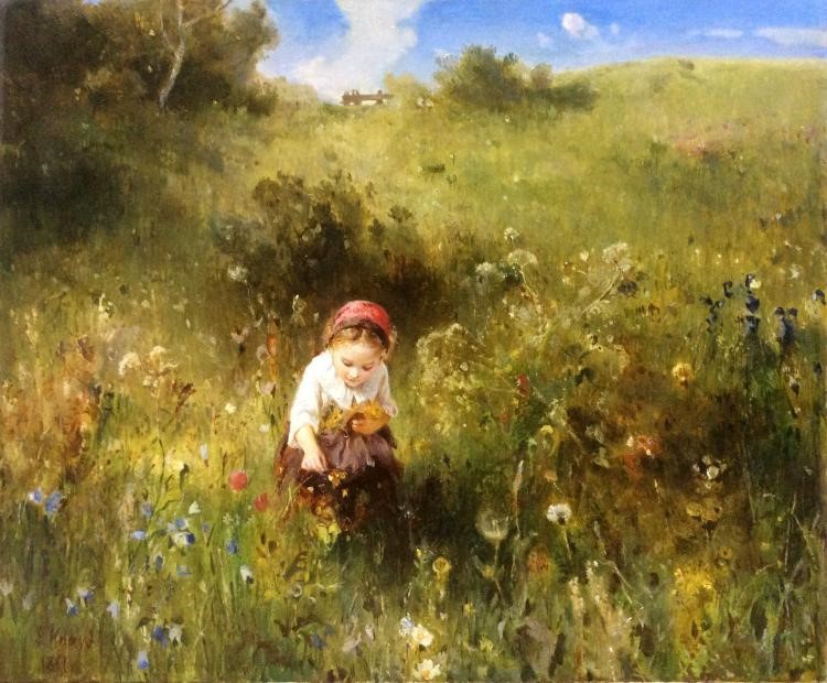 The painting depicts an idyllic scene from village life. A little girl in a headscarf enthusiastically picks wild flowers in a meadow full of herbs and colors. Her outfit is simple: a white shirt and a dark skirt harmoniously fit into the natural landscape. Light sunlight gently illuminates her figure, creating an atmosphere of warmth and comfort.