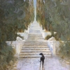 The painting depicts a majestic staircase going up, as if leading to infinity or to a mysterious place beyond the visible. The staircase is lined with white stone and surrounded by symmetrical sculptures of lions, which adds a sense of monumentality and solemnity.
