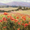 The color palette of the painting is soft and warm: a combination of red, green, blue and pastel tones creates a feeling of coziness and peace. The lines and textures convey the movement of the wind as it gently sways the poppies and runs across the field, creating a lively and dynamic atmosphere.