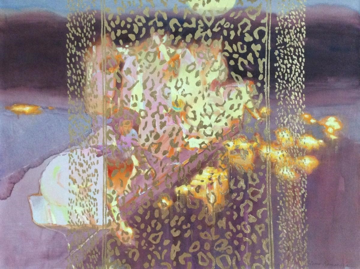 The painting captivates with its mysterious and atmospheric composition. In the center is a scene, as if hidden behind a translucent curtain, decorated with golden ornaments. These patterns resemble shimmering reflections of light or fantasy shadows, which creates a sense of mystery and multi-layeredness of the image.