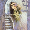 In the center of the composition is a figure of a girl sitting on the steps with a lush bouquet of flowers. Her silhouette is slightly blurry, perhaps made with light, airy strokes, which gives the image a fairy tale and mystery. The bouquet - lush, filled with pink, yellow and green shades - becomes a bright detail of the painting, enlivening the calm architectural background.