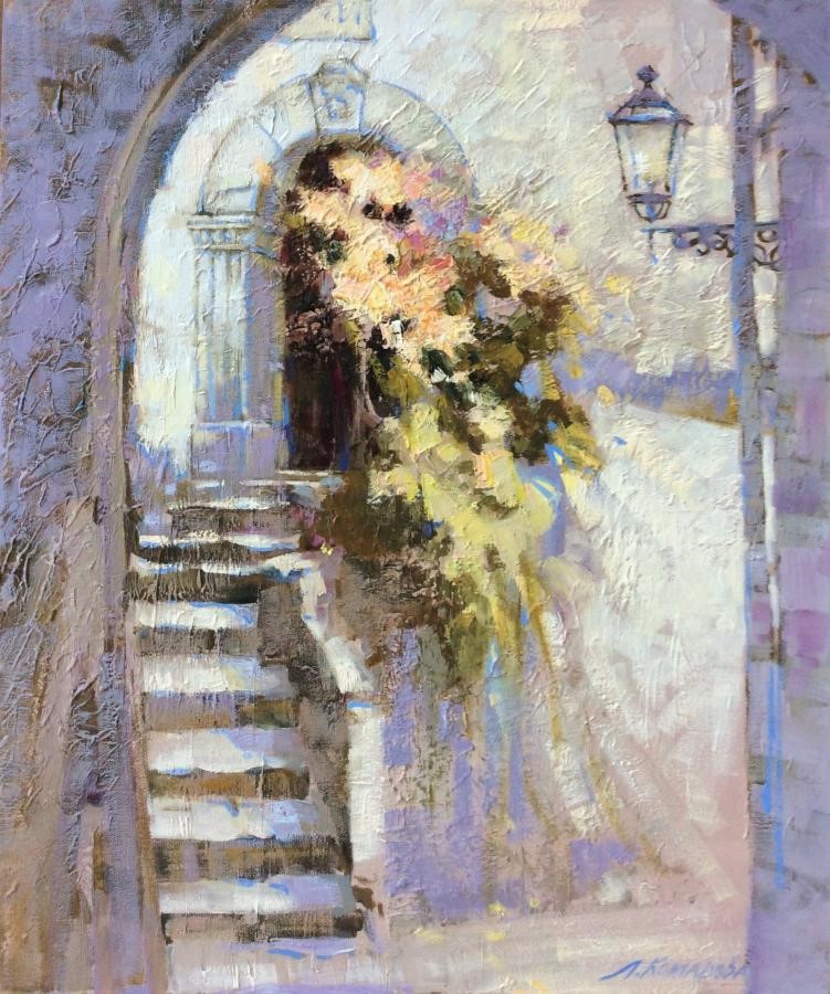 The painting with muted, pastel strokes transports the viewer to a corner of a quiet old town, saturated with sunlight and tranquility. The stone stairs leading to the curved arched entrance are paved with uneven steps, as if they have preserved the imprint of time. Warm light falls on the walls and stairs, creating a play of light and shadow.
