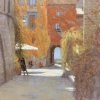 The painting depicts a cozy corner of an old town, immersed in a golden autumn palette. A narrow cobbled street, surrounded by stone walls of houses with windows and massive doorways, is immersed in the warmth of sunlight. The main coloring is set by bright climbing plants on the walls of the buildings - rich shades of yellow, orange and terracotta create a charming feeling of autumn.