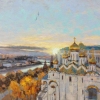 The painting depicts a majestic view of the golden domes of an Orthodox cathedral against the backdrop of a gentle sunset sky filled with warm shades. The domes, shining golden in the sun, stand out for their brightness and solemnity, symbolizing spirituality and eternity. The snow-white facades of the cathedral give the composition a sense of purity and nobility.