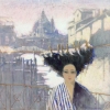 The background of the painting is decorated in soft pastel colors, where the outlines of ancient architecture are visible - a majestic cathedral, narrow bridges and canals of the city. Such details evoke associations with Venice or another European city on the water. The reflection of buildings and bridges in the calm water surface adds even more airiness and poetry to the composition.