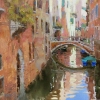The painting is filled with warm golden yellow, orange and soft dark shades, which creates a mood of coziness, romance and light nostalgia. This is a story about Venice, where every moment remains forever in the heart with its beauty and the tranquility of a magical evening.