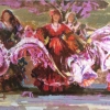 The waves of fabric of their dresses seem to come to life, creating a vortex of lines and shapes - each swing of the hem conveys the plasticity and beauty of folk dance. The play of light and shadow emphasizes the texture of the materials and adds depth to the image. Light brushstrokes indicate the shine of the fabrics, creating a sense of festivity.