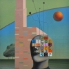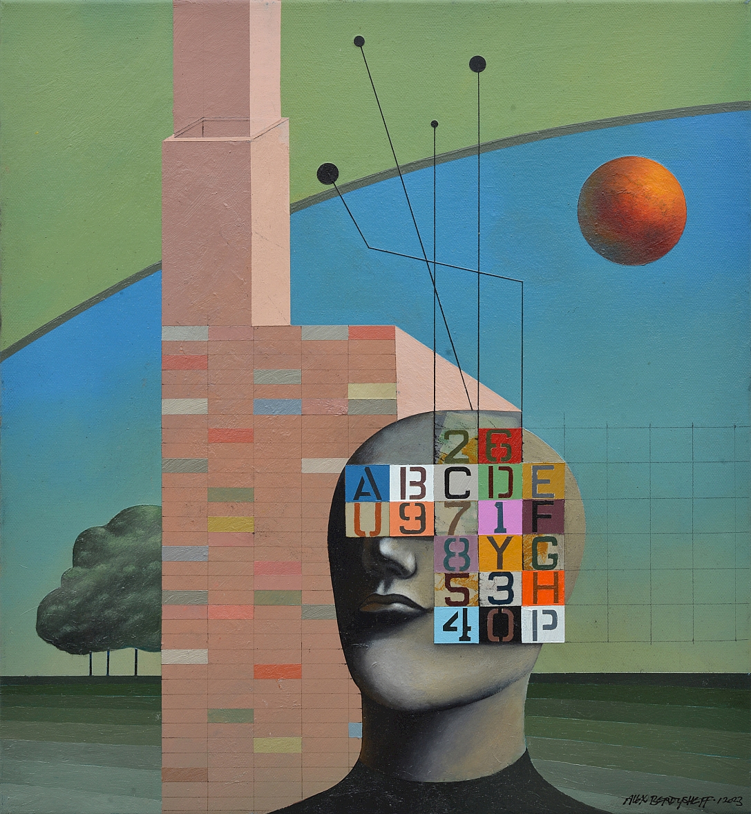 The central figure is a static head, part of the face covered by a grid of multicolored squares with letters and numbers. This symbolizes the «encoding» of consciousness, where human perception is replaced by a dry set of data. Lines rising from this «information block» connect the individual to something external, possibly a higher intelligence or a global network. The brickwork nearby emphasizes the contrast between the imperfection of the handmade world and the rigidity of digital code.