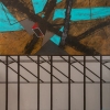 The lower part is executed in a strict, almost architectural manner: repeating vertical supports and diagonal shadows create a sense of a solid but enclosed space, resembling a bridge or a roof. This is the zone of structure and order.