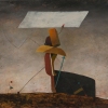 The central «geometrical object» balances on the very edge of the horizon, creating a sense of stability in an unstable world. A rectangular white shape floating above the horizon seems to embody that very «geometrical dream», free from the chaos of real nature.