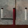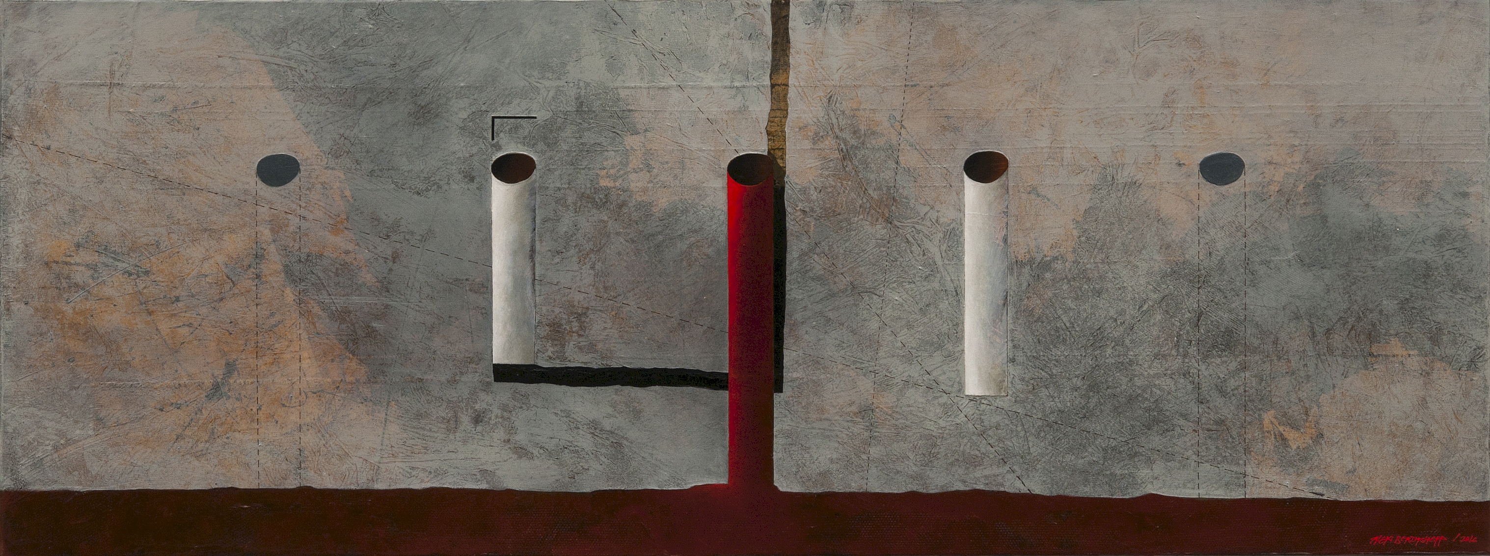 On the gray, time-worn «wall» are cylindrical elements. The central red pipe is the only bright accent; its verticality pierces the entire composition, creating powerful tension. The other «openings» or columns only hint at their presence, creating a feeling of emptiness and anticipation.