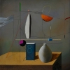 «Stabile VIII» by Alexander Berdyshev continues the exploration of metaphysical still life, where real objects transform into pure symbols. The composition is built on the contrast between the heavy textured surface of the table (possibly imitating wood or earth) and the airy drafting structure floating above it.