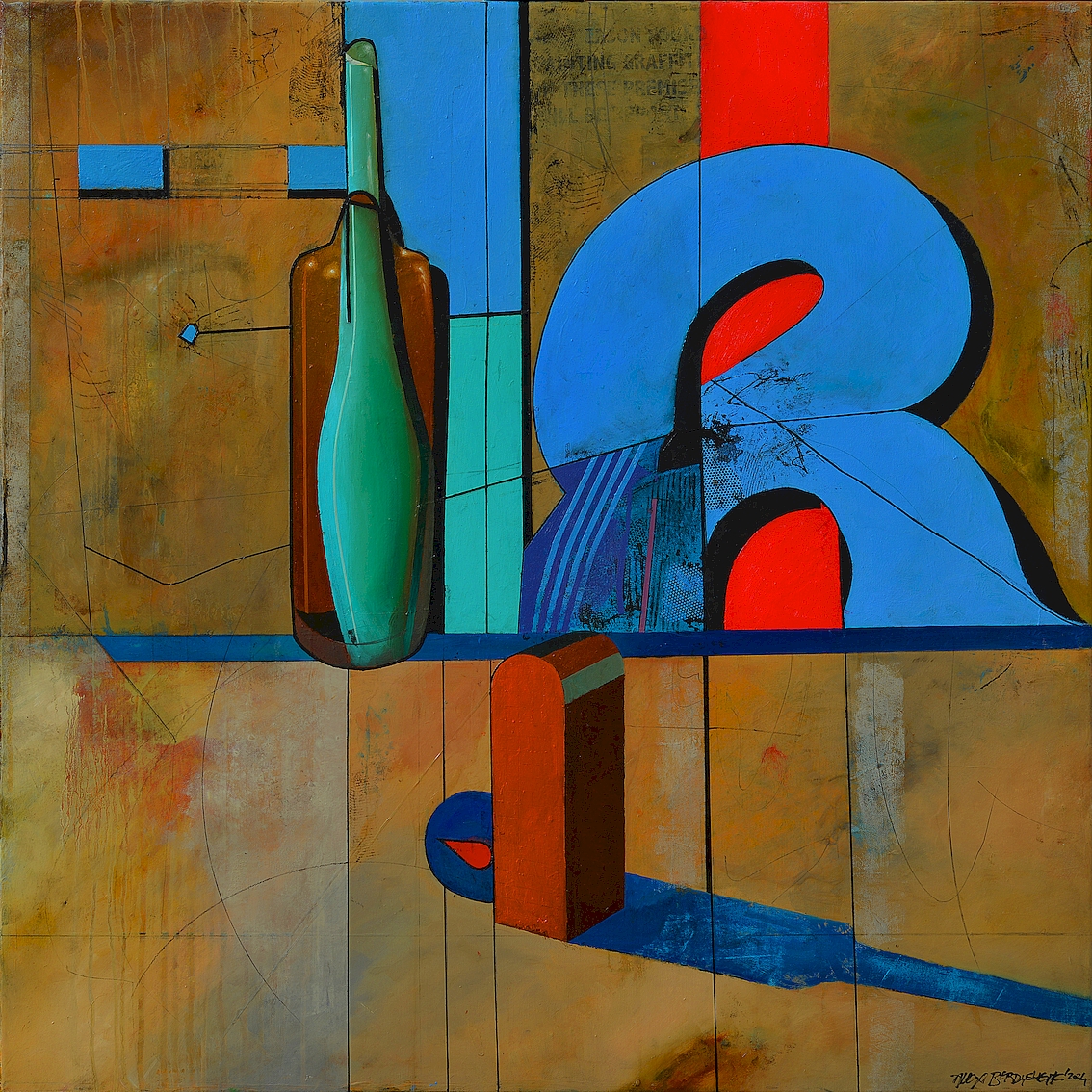 Geometric lines and color blocks resemble advertising signs or layers of street tags superimposed on each other. Berdyshev reinterprets space, turning the still life not into a quiet scene but into a living fragment of the urban environment. This is art that breathes asphalt, neon, and the search for form in the chaos of modern life.
