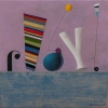 Alexander Berdyshev's painting «Performing Objects III» transforms an ordinary space into a stage for an abstract performance. Against a softly lilac, velvety background reminiscent of a theatrical curtain, an ensemble of geometric and organic shapes unfolds.