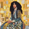 This vibrant piece of contemporary art depicts a beautiful young Black woman sitting with quiet dignity. Her hands are gracefully folded on her lap. She is regal and exudes a calm confidence that captures the viewer’s attention and invites deeper contemplation.