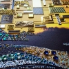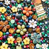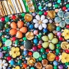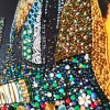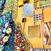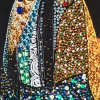 The woman’s dress is richly adorned with a mosaic of semi-precious stones (carnelian, jade, agate, amethyst, amazonite, rose quartz, chalcedony, moonstone, aquamarine, malachite, turquoise) and rhinestones. Bright floral motifs, shimmering beads, and ornaments create a striking play of color and texture, reflecting cultural richness and femininity.