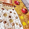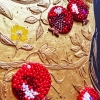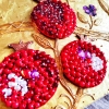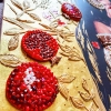 Wooden pomegranate fruits are decorated with stones, beads, and rhinestones.