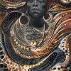 Before us stands the image of a powerful shaman, whose face, framed by an elaborate headdress, radiates calm strength. His gaze, direct and penetrating, seems to see through, revealing the depth of wisdom and ancient knowledge. High cheekbones, a defined profile, and full lips give his appearance nobility and dignity.