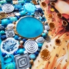 The turquoise accents in the artwork evoke feelings of calmness and serenity, reminiscent of clear skies and tranquil waters. The warm amber tones add a touch of golden warmth, symbolizing hope and vitality. Meanwhile, the deep blues of the agates contribute depth and richness to the piece, creating a lush backdrop that enhances the ethereal quality of the central figures.