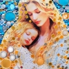 This enchanting painting captures a serene moment at its center: a beautiful, light-haired woman embraces a charming light-haired girl. Together, they radiate a mesmerizing glow of white, blue, and gold, enveloping the viewer in a sense of tranquility. Their eyes are gently closed, exuding an aura of love and harmony that transcends the artwork.
