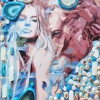 A painting where reality intertwines with mysticism, and the human soul finds reflection in the image of an animal. A semi-abstract figure of a woman, enveloped in cool shades of blue and azure, appears before us with pale skin and hair as if woven from moonlight. Her gaze, direct and piercing, captivates attention, compelling one to pause and look deep into her eyes.
