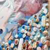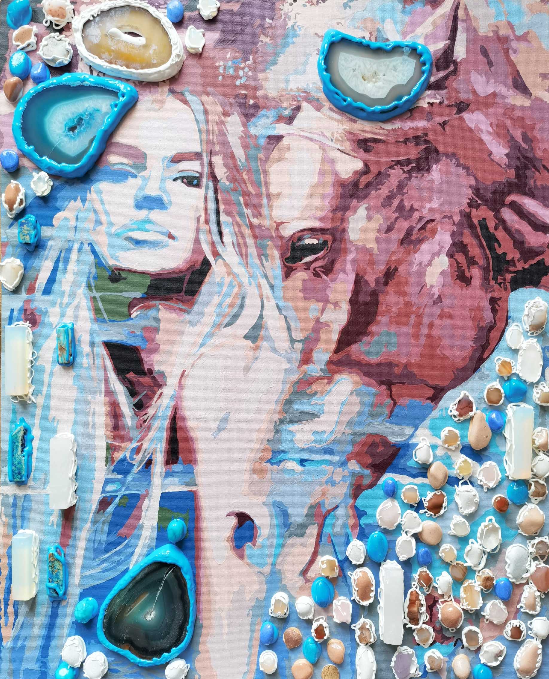 The painting comes alive thanks to a scattering of semi-precious stones and beads. Agates, rose quartz, moonstone, carnelian, and the unique variscite from California, USA, add depth, texture, and magical radiance. Each stone carries its own energy, enhancing the overall impression.