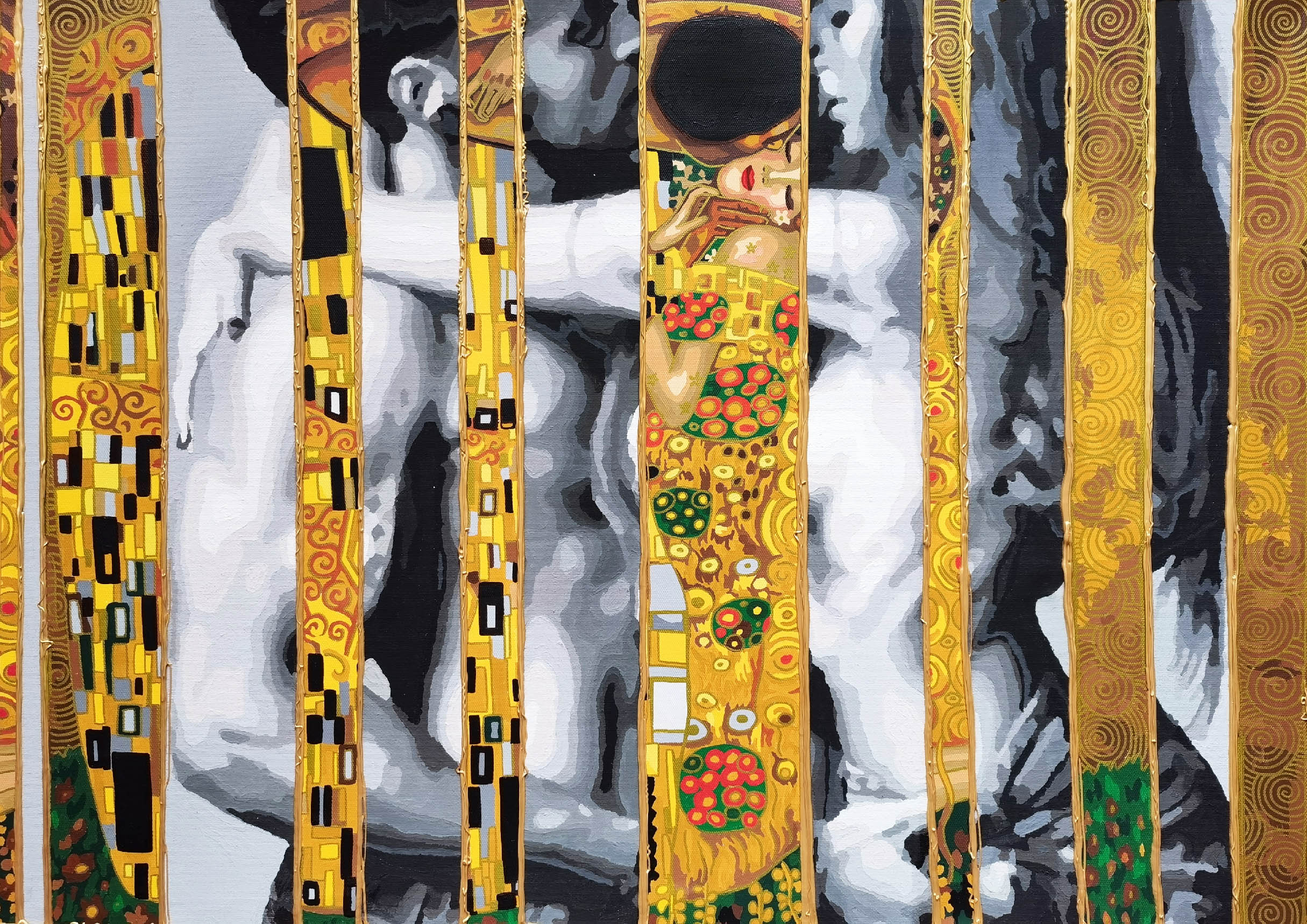 The painting "The Kiss" is a dialogue between two worlds captured in one space. The eternal theme of love and intimacy through the prism of completely different artistic languages.