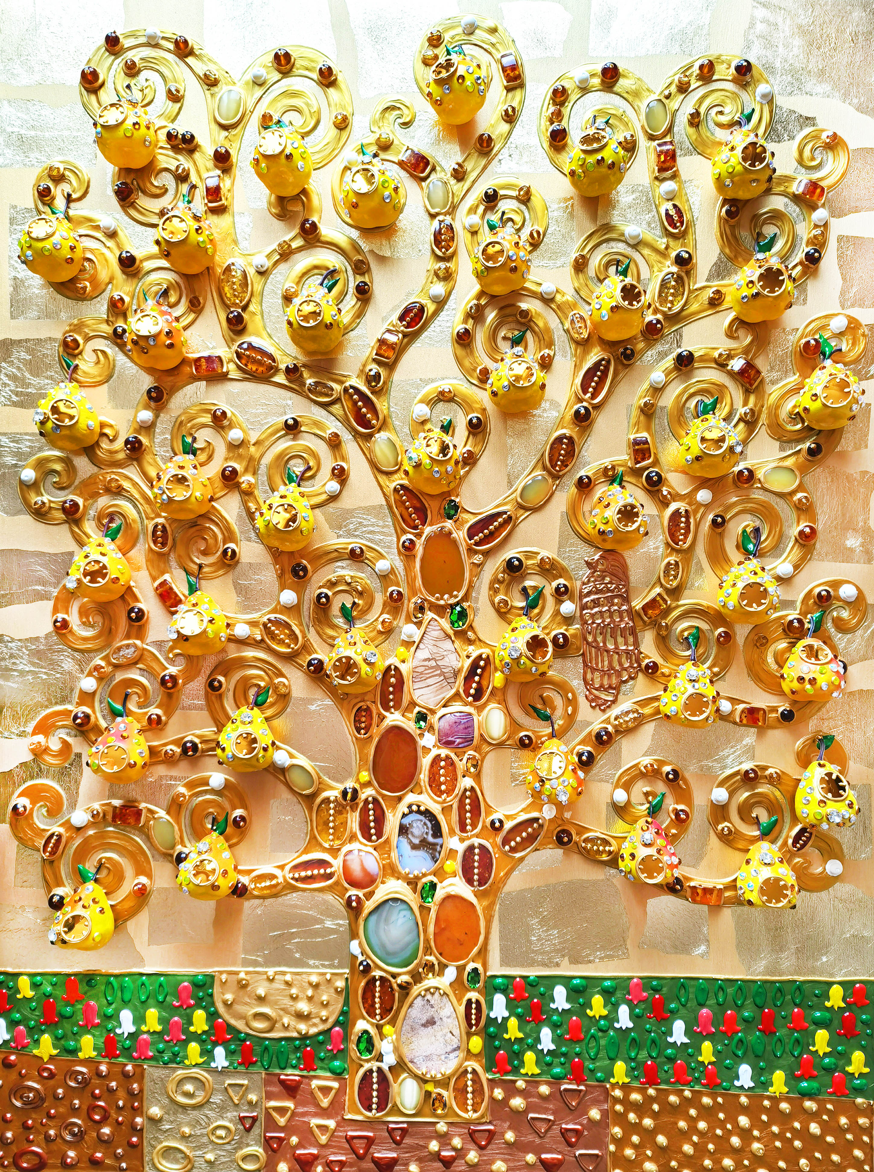 A unique amber painting "Pear Tree," inspired by the grandeur of Klimt's "Tree of Life," yet possessing its own distinctive character.