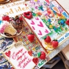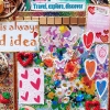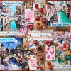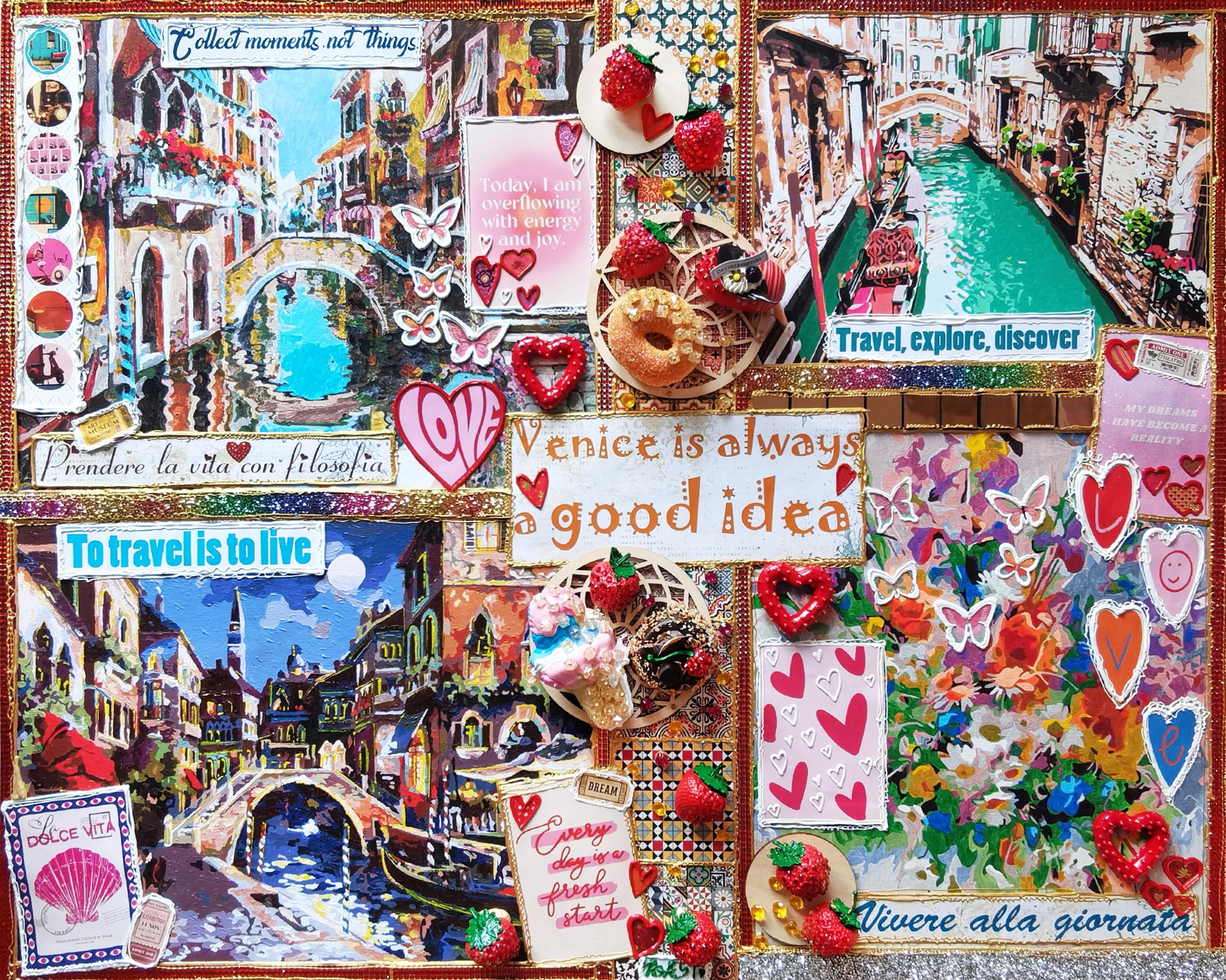 The painting resembles a travel journal. It gathers impressions, emotions, and details as if brought back from a trip: vintage postcards, inspiring inscriptions, decorative hearts, and butterflies. The layered composition, three-dimensional elements, sparkling accents, and textured inserts create a sense of depth and make the piece almost tangible.