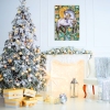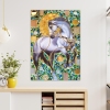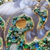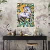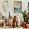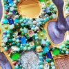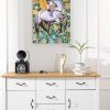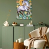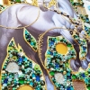 Smoky, silver, and pearl tones blend harmoniously with the grassy, mint green background and sparkling large blue rhinestones, creating a striking contrast. Gold mirrored elements and rhinestones add a touch of chic and sophistication, adding a warm, sunny glow to the painting.